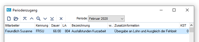 - Erstellen sie einen Periodenzugang mit der Lohnart 804 und dem Wert der Ausfallstunden (1804) um den Mitarbeitern die Differenz gutzuschreiben und eine Lohnart für den Export an die die Lohnabrechnung zu haben.